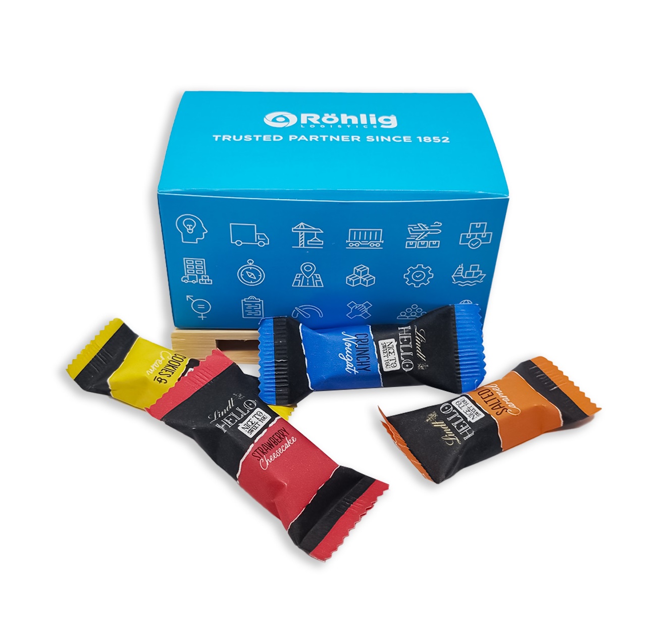 Gift box on a pallet filled with Lindt Mini Sticks in the flavors: Salted Caramel, Cookies & Cream, Crunchy Nougat and Strawberry Cheesecake.